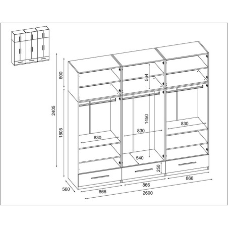 Dulap 260/240 - bare pentru haine, rafturi interne, sertare externe