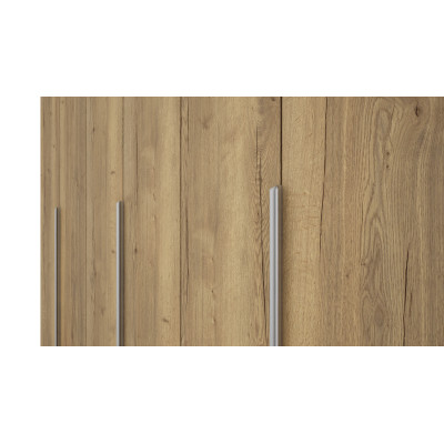 Dulapa modernă cu 6 uși cu dimensiunile 240x240 cm este o soluție elegantă și practică pentru persoanele care apreciază funcționalitatea și aspectul elegant. Combinația dintre bej cașmir și decorul stejar Halifax creează o compoziție cromatică caldă și primitoare, care se potrivește perfect în interioarele moderne și clasice. Oglinda plasată pe față nu numai că mărește optic spațiul, ci îndeplinește și o funcție practică în utilizarea zilnică. Ansamblul este completat de mânerele argintii, care adaugă eleganță subtilă mobilei.