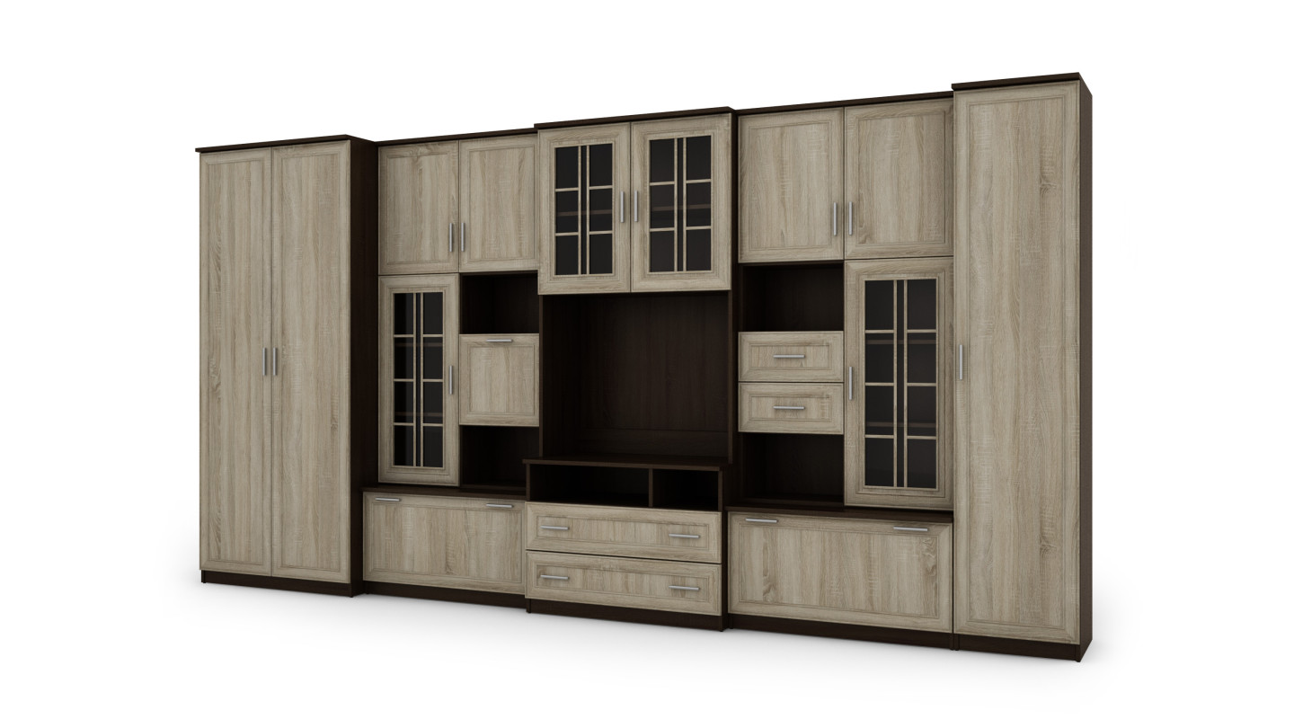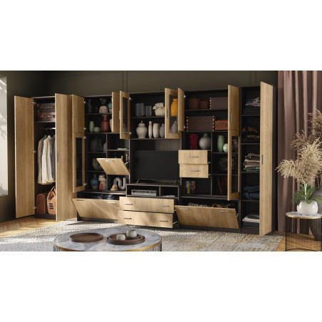 Mobilierul constă dintr-un dulap mare cu bară de agățat, dulap de lenjerie cu cinci rafturi, vitrină din sticlă, sertare, bar, nișe deschise și o nișă mare pentru televizor. Este o soluție excelentă pentru persoanele care au nevoie de mult spațiu de depozitare pentru diverse obiecte, de la haine la cărți, decorațiuni sau echipamente electronice. Peretele mobil LENA permite menținerea ordinii în cameră, oferind în același timp acces ușor la lucrurile necesare.