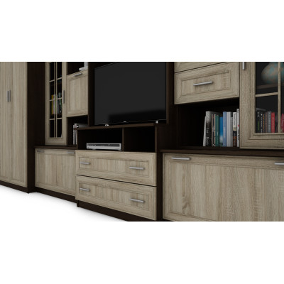 - dulap TV cu nișă mare pentru televizor (sertare foarte încăpătoare în partea de jos) și extensie sub forma unei vitrine din sticlă.