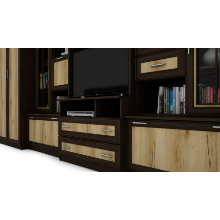 - dulap TV cu nișă mare pentru televizor (sertare foarte încăpătoare în partea de jos) și extensie sub forma unei vitrine din sticlă.