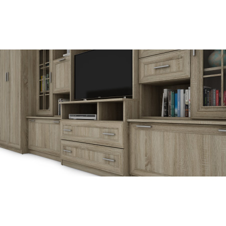 - dulap TV cu nișă mare pentru televizor (sertare foarte încăpătoare în partea de jos) și extensie sub forma unei vitrine din sticlă.