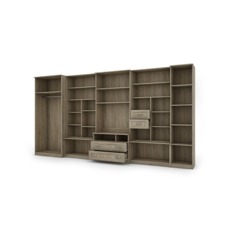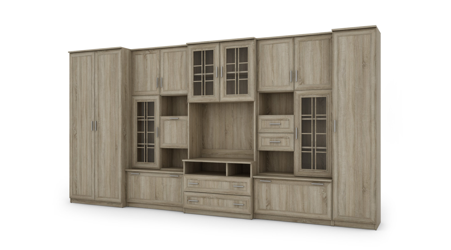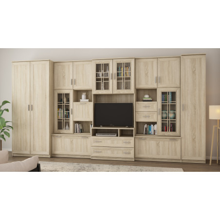 Mobilierul constă dintr-un dulap mare cu bară de agățat, dulap de lenjerie cu cinci rafturi, vitrină din sticlă, sertare, bar, nișe deschise și o nișă mare pentru televizor. Este o soluție excelentă pentru persoanele care au nevoie de mult spațiu de depozitare pentru diverse obiecte, de la haine la cărți, decorațiuni sau echipamente electronice. Peretele mobil LENA permite menținerea ordinii în cameră, oferind în același timp acces ușor la lucrurile necesare.