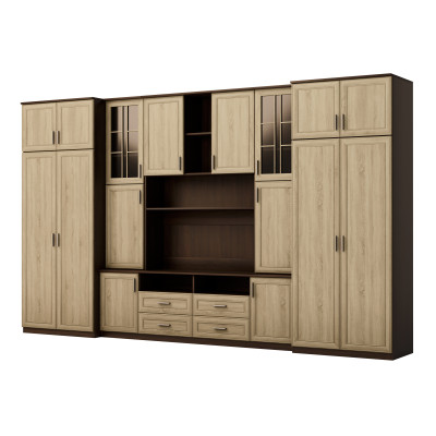 Setul este destinat persoanelor care vor să maximizeze utilizarea spațiului disponibil. În peretele mobilier prezentat găsești tot ce ai nevoie – dulap de haine cu bară pentru umerașe, dulap pentru lenjerie cu 5 rafturi, vitrine din sticlă, sertare, bar, nișe deschise și închise în spatele ușilor, și chiar o nișă mare pentru televizor cu spațiu jos pentru decoder TV etc.
