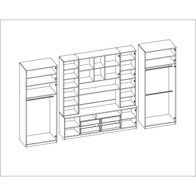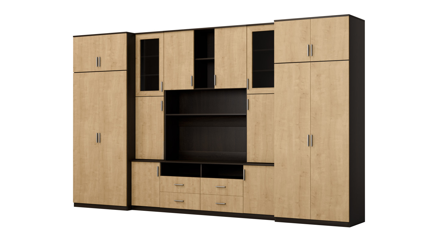 Setul este destinat persoanelor care vor să maximizeze utilizarea spațiului disponibil. În peretele mobilier prezentat găsești tot ce ai nevoie – dulap de haine cu bară pentru umerașe, dulap pentru lenjerie cu 5 rafturi, vitrine din sticlă, sertare, bar, nișe deschise și închise în spatele ușilor, și chiar o nișă mare pentru televizor cu spațiu jos pentru decoder TV etc.