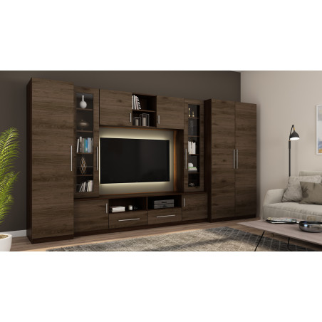 - Extensii TV cu un număr mare de rafturi deschise, închise și două vitrine mari din sticlă.
