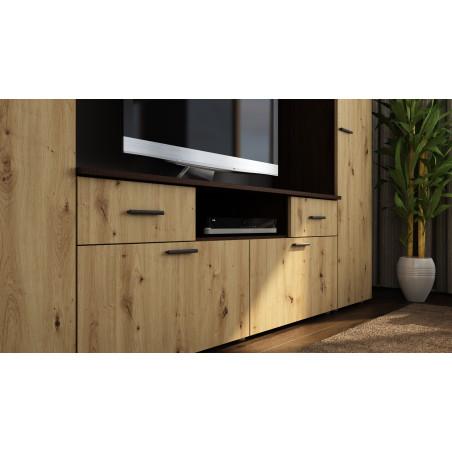 Peretele unitate cu dulap multimedia este o piesă de mobilier elegantă și funcțională care se va potrivi perfect în camera ta. Un sistem complex care combină rafturi, dulapuri și spațiu dedicat echipamentelor de divertisment.