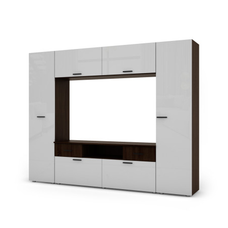 Peretele unitate cu dulap multimedia este o piesă de mobilier elegantă și funcțională care se va potrivi perfect în camera ta. Un sistem complex care combină rafturi, dulapuri și spațiu dedicat echipamentelor de divertisment.