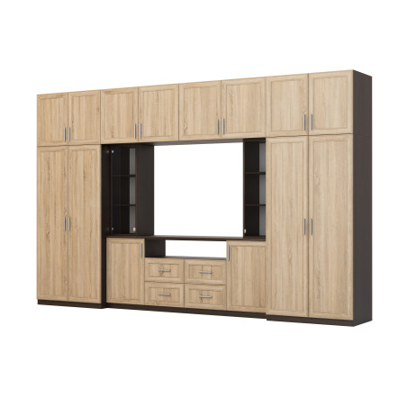 - extensii cu închidere cu rafturi pe toată lățimea setului. Datorită lor, înălțimea totală a mobilierului living este de până la 240 cm.