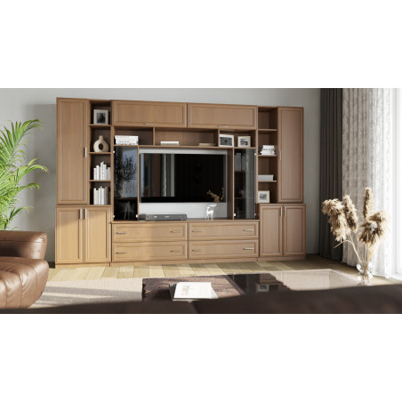 Spațiul TV a fost proiectat având în vedere sistemele multimedia moderne – poți instala liber un televizor, decoder, consolă sau soundbar, iar rafturile și dulapurile suplimentare vor ajuta să ascunzi cablurile și accesoriile.